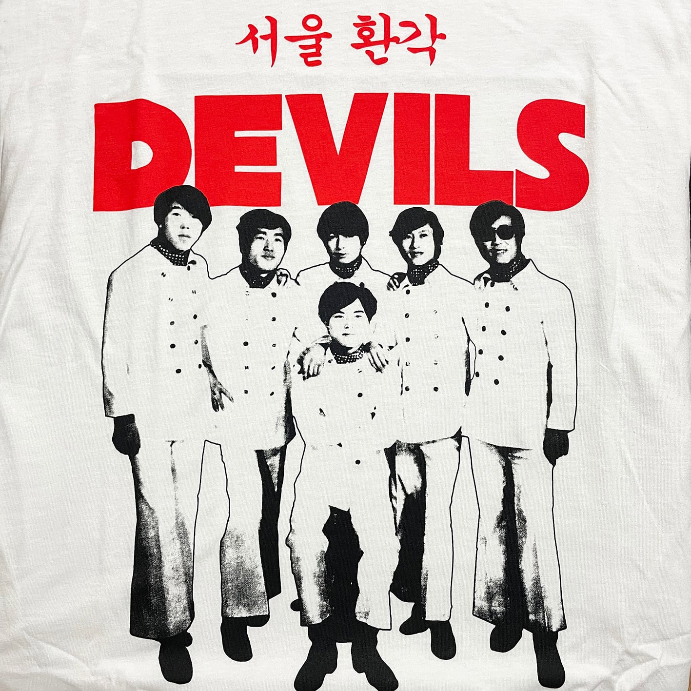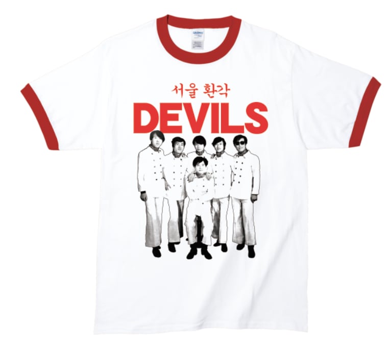 68年結成の韓国GSファンク・グループ・THE DEVILSの71年年リースアルバム「1 st)」のジャケットをシルクスクリーンプリントしたトリムTシャツです。